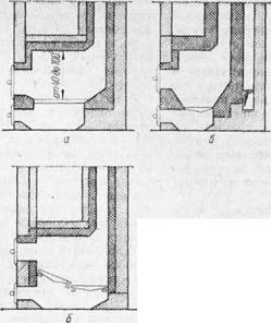 Высота топливника зависит от вида топлива. При использовании дров она колеблется от 420 до 1000 мм, считая от колосниковой решетки (от 6 до 15 рядов кладки). Колосниковую решетку укладывают обычно на 1–2 ряда ниже уровня топочной дверцы с тем, чтобы при ее открывания горящие угли не выпадали на пол. Иногда колосниковую решетку устанавливают с наклоном, при котором задняя часть ее выше передней на 4–5 см. Такой подъем пода обеспечивает более равномерное горение топлива и отделенно пламени от дыма (рис. 1, а).