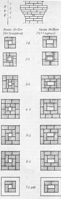 Размеры сечения дымового канала зависят как от типа печи, так и от ее теплопропзводительности. Сечение 1 /2 х 1 /2 кирпича достаточно для печей с теплоотдачей до 3000 ккал/ч. 1 /2 х 3 /4 – для печей с теплоотдачей до 4500 ккал/ч.