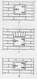 Рис. 2. Перекрытие топочной дверки: а – напуском; 6 – «в замок»; в – клиновидным кирпичом