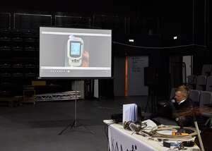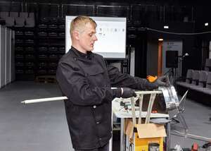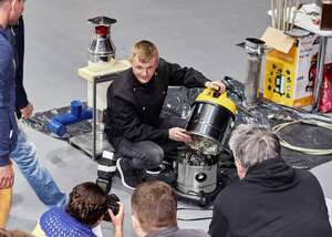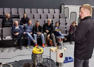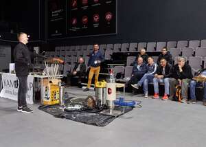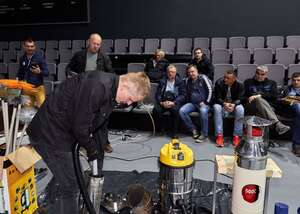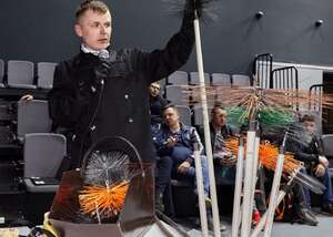 Денис устроил настоящее шоу, продемонстрировав работу современным трубочистным оборудованием в условиях приближенных к реальным. Параллельно видеоряд и слайдшоу наглядно показывали, с какими условиями приходится встречаться на практике современным трубочистам. С помощью ротационного ерша была пройдена сендвич-труба, заполненная монтажной пеной. Мусор, который образовывался в процессе устранения засора втягивался промышленным пылесосом, что превращает традиционно считающуюся самой грязной работу в безвредный для здоровья технологически продуманный труд. Денис сделал особенный акцент на использовании современных средств индивидуальной защиты и средствах страховки на высоте, так как профессия трубочиста сопряжена с риском.