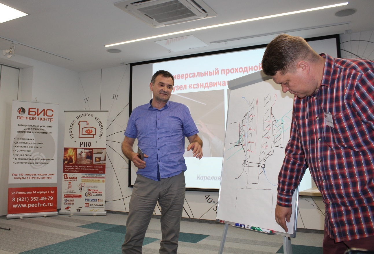 Леонид Грошев – Печной центр “Дятловы Горы” (Нижний Новгород) присоединился к докладу и рассказал, как на практике применяется разделка, а так же показал что на практике происходит при неправильной изоляции труб. Обоими докладчиками были представлены результаты испытаний, которые проходили в лаборатории МЧС, и конечно профессиональная работа с аудиторией.