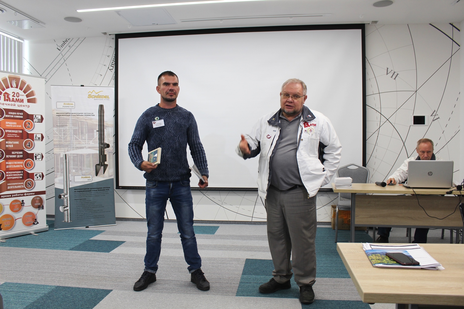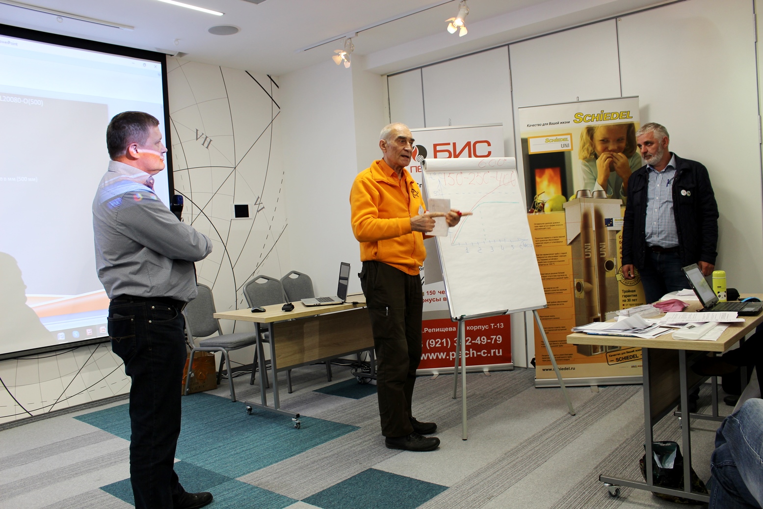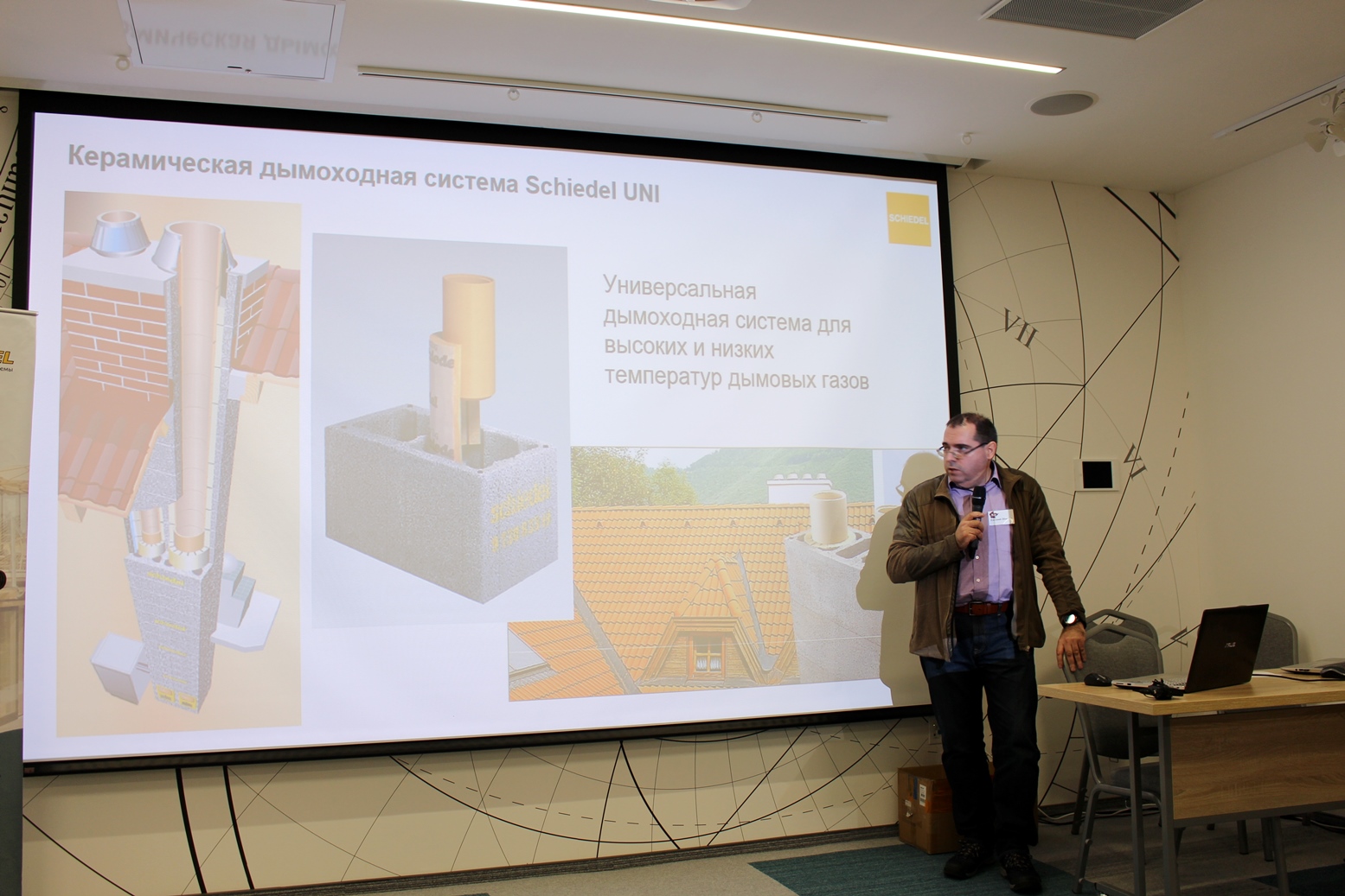 После Станислава слово взяли представители компании SCHIDEL Роман Большаков и Евгений Шведов. Они рассказали, что такое керамическая система UNI и система двухконтурных дымоходов с изоляцией PERMETR, и показали на слайдах, как на практике работает труба в высокотемпературном режиме.