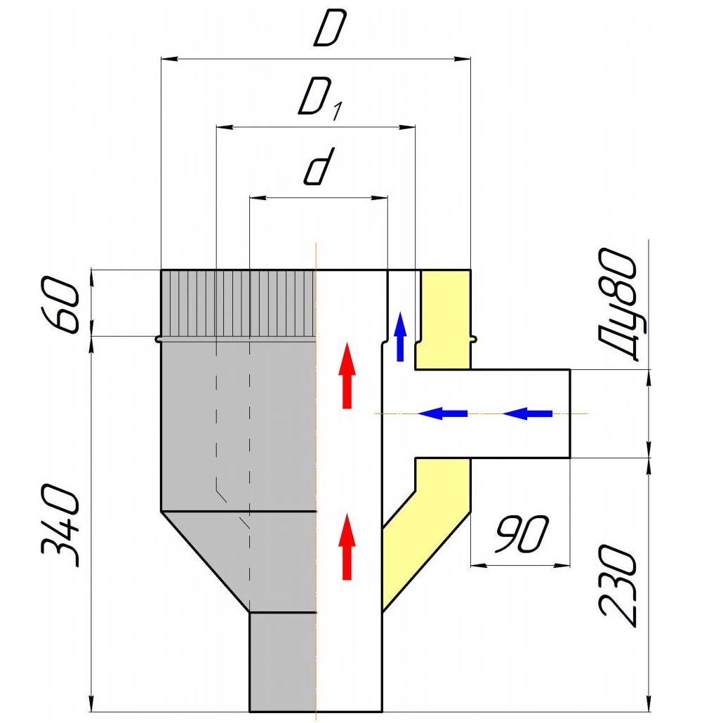 Адаптер переход с врезкой Ду 80 АПВ 80 вентилируемый производства «КДМ» является основным фасонным элементом трехконтурного стального дымохода, который позволяет перейти с одностенной трубы на трехконтурную вентилируемую трубу с одновременным подключением воздушного канала для охлаждения трехконтурного дымохода. Адаптер переход с врезкой Ду 80 АПВ 80 трехконтурный представляет собой конструкцию, состоящую из трех труб разного диаметра, которые разделяют внутренний дымовой канал, вентилируемый воздушный контур, слой керамического изолятора "Супервул". В нижней части элемента находится одностенный фланец с внутренним раструбом для обеспечения соединения с одностенной стальной трубой "по конденсату". Затем следует конусный переход с одностенной трубы на трехконтурную. В верхней части две внутренние трубы имеют внешний раструб для соединения с входящей в нее сверху трехконтурной трубой "по-конденсату", а наружная имеет внутренний раструб, для соединения "по-дыму" (это обеспечивает защиту утеплителя от попадания атмосферных осадков). Сбоку верхней части элемента (перпендикулярно) находится фланец подключения воздуха в вентилируемый канал. Воздушный канал и изоляционный слой, являются элементами первичной противопожарной разделки, а также обеспечивают утепление и защиту от образования конденсата. На место соединения Адаптера со стальными трубами наносится термостойкий силикатный герметик для обеспечения газоплотности. Принцип работы трехконтурной трубы и фасонных трехконтурных элементов «КДМ» заключается в том, что внутренняя труба, по которой идет дым, охлаждается за счет вентиляции. Избыточное тепло от внутреннего контура отводится с помощью проходящего воздушного потока, тем самым исключается перегрев. Попутно решается вопрос вентиляции. Это один из главных факторов долговечности трехконтурных дымоходов «КДМ». Другим важным фактором является применение профессиональных материалов и высокое качество исполнения.