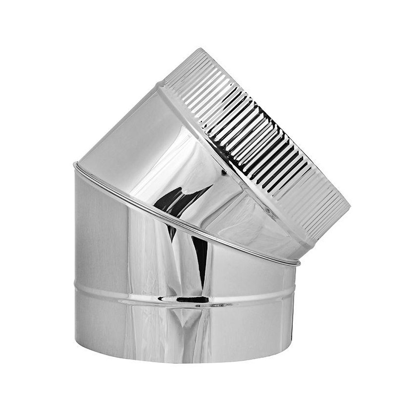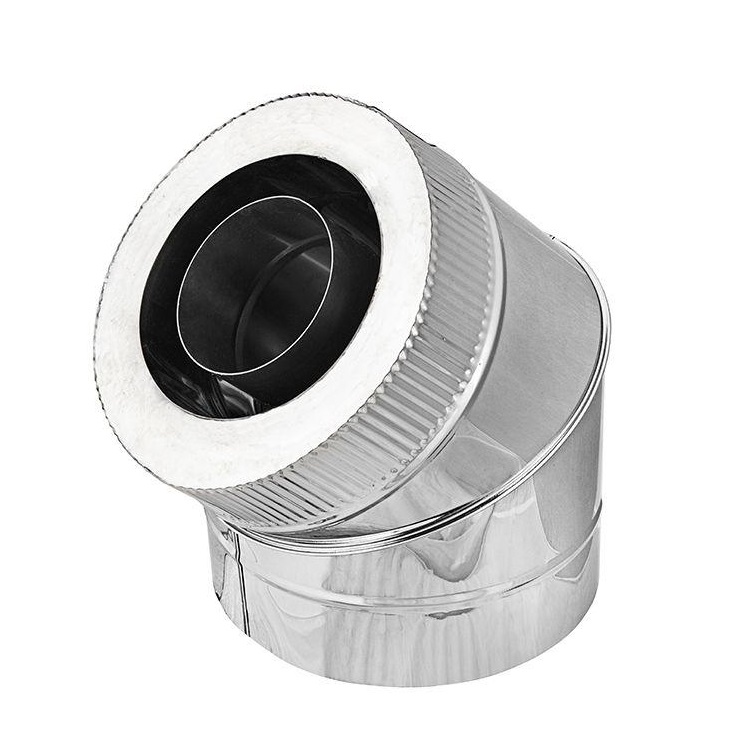 Внутренний контур Отвода вентилируемого 45° 2-х сегментного ОТИВ 45 производства «КДМ» выполнен из легированной титаном нержавеющей стали марки AISI 439TI, толщиной 1мм, которая обладает жаростойкими, антикоррозионными и кислотостойкими свойствами. Ее применение делает дымоход «КДМ» абсолютно надежным и долговечным, рекомендованным для применения в банных и отопичельных печах, каминных топках, а также твердотопливных котлах.
