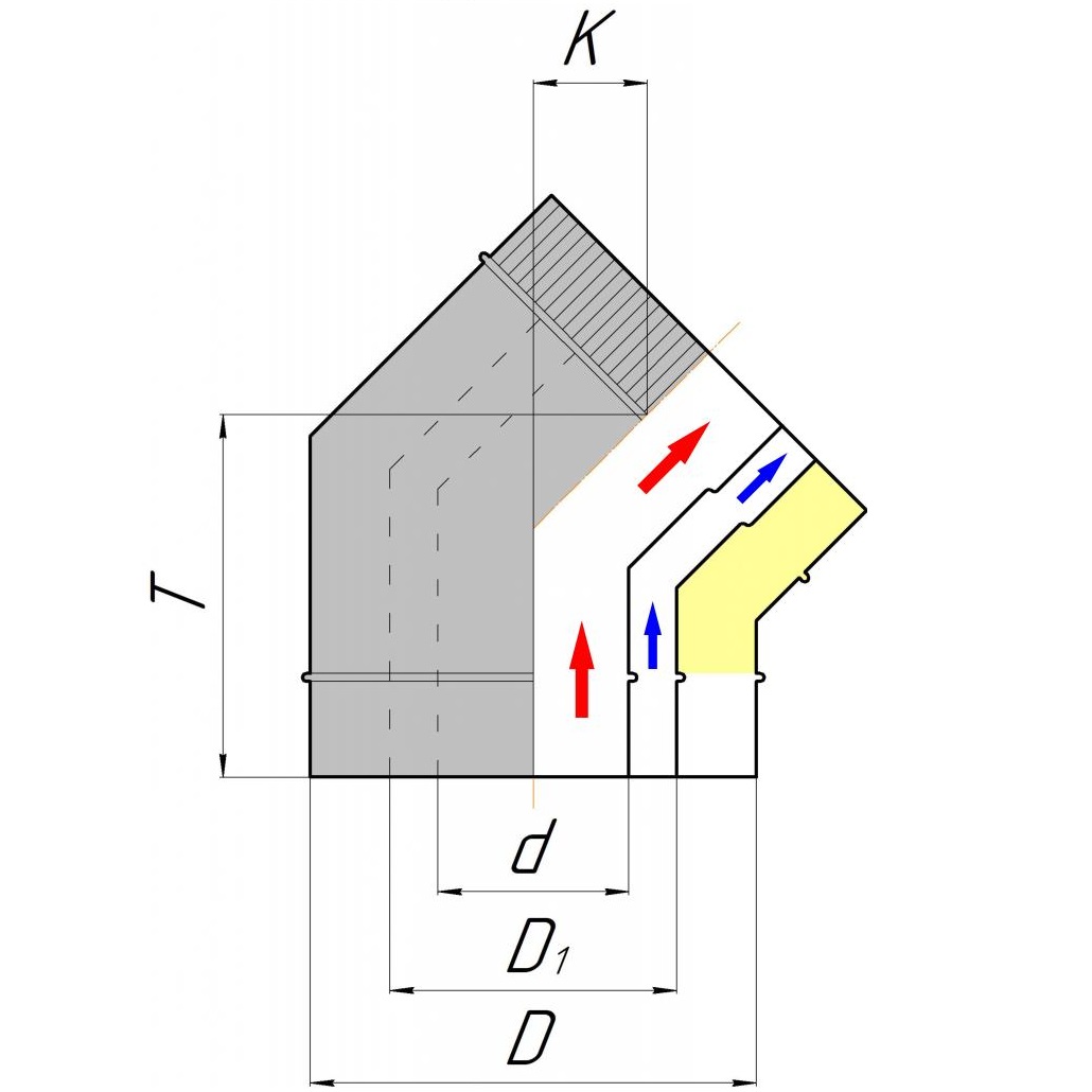 Отвод вентилируемый 45° 2-х сегментный ОТИВ 45 производства «КДМ» является основным фасонным элементом трехконтурной дымоходной системы, который позволяет изменить направление трубы на 45°, когда необходимо изменить угол или обойти препятствие. Отвод 45° 2-х сегментный ОТИВ 45 представляет собой конструкцию (угловой элемент дымохода), состоящую из труб разного диаметра, которые разделяют внутренний дымовой канал, вентилируемый воздушный контур, слой керамического изолятора "Супервул". Конструктивно состоит из 2-х сегментов, что позволяет плавно изменить направление дымохода на 45°, не создавая сопротивления дымовому потоку. На концах отвода 2 внутренние трубы имеют внутренние и внешние раструбы, для соединения с трехконтурной трубой «КДМ» и другими фасонными элементами вентилируемого дымохода "по-конденсату". Наружная труба имеет на концах раструбы обеспечивающие ее соединение "по-дыму", для защиты керамического изолятора от попадания атмосферных осадков. На место соединения Отвода с трубой наносится термостойкий силикатный герметик для обеспечения газоплотности. Принцип работы трехконтурной трубы и фасонных трехконтурных элементов «КДМ» заключается в том, что внутренняя труба, по которой идет дым, охлаждается за счет вентиляции. Избыточное тепло от внутреннего контура отводится с помощью проходящего воздушного потока, тем самым исключается перегрев. Попутно решается вопрос вентиляции. Это один из главных факторов долговечности трехконтурных дымоходов «КДМ». Другим важным фактором является применение профессиональных материалов и высокое качество исполнения.