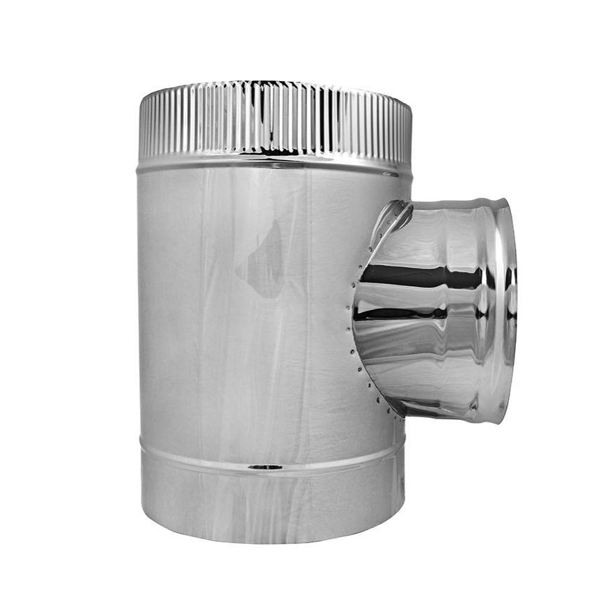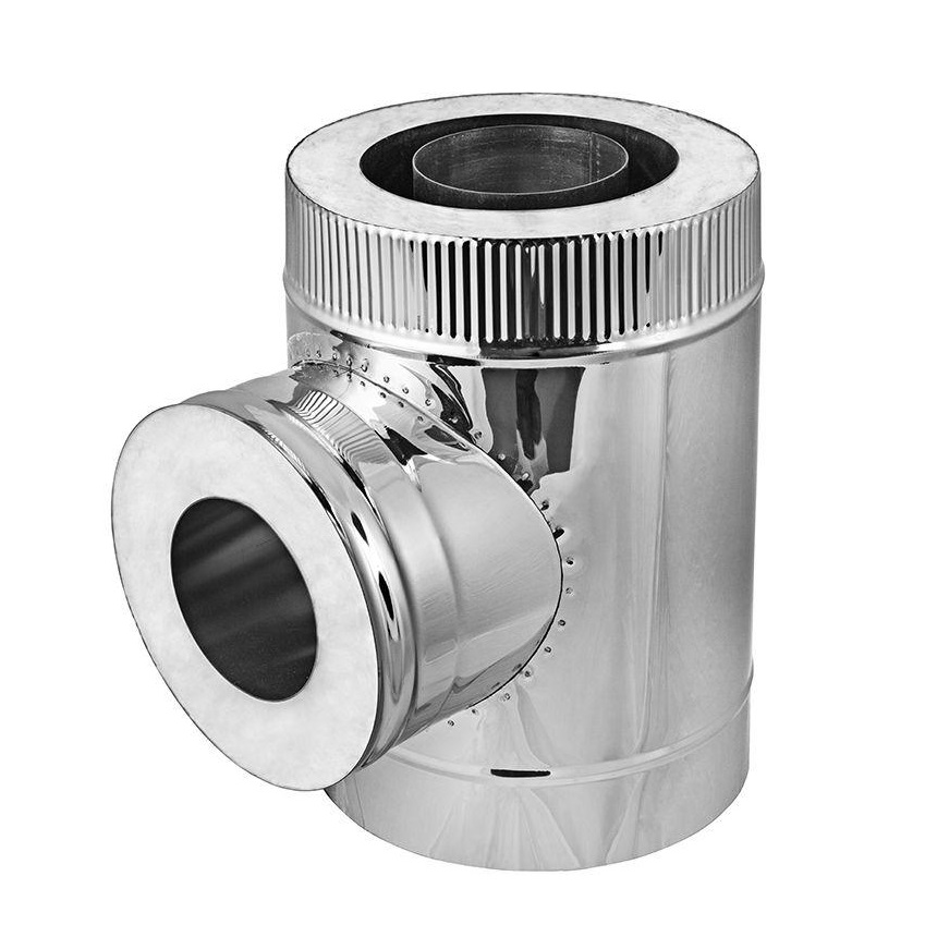 Внутренний контур тройника вентилируемого 90° ТТИВ 90 производства «КДМ» выполнен из легированной титаном нержавеющей стали марки AISI 439TI, толщиной 1мм, которая обладает жаростойкими, антикоррозионными и кислотостойкими свойствами. Ее применение делает дымоход «КДМ» абсолютно надежным и долговечным, рекомендованным для применения в банных и отопичельных печах, каминных топках, а также твердотопливных котлах.