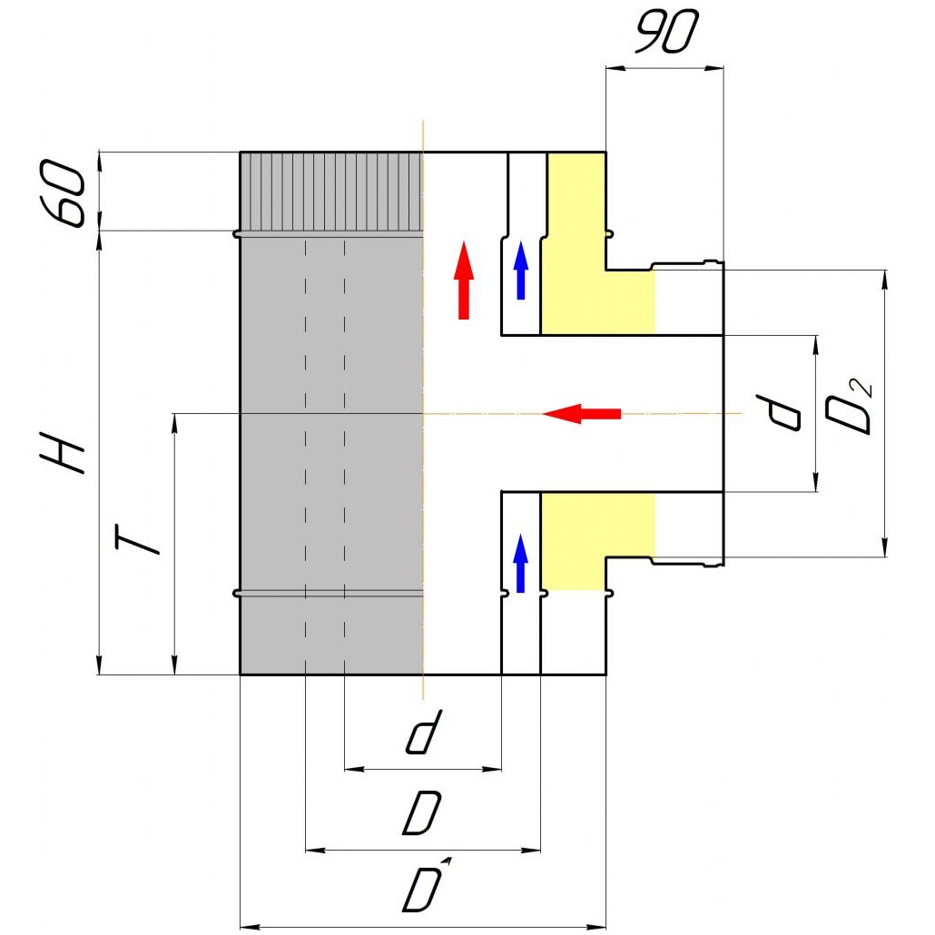 Тройник трехконтурный 90° ТТИВ 90 производства «КДМ» является основным фасонным элементом трехконтурной дымоходной системы. Применяется для отвода дымовых газов в прямой участок дымохода, при подключении отопительного устройства к наружному дымоходу. Тройник трехконтурный 90° ТТИВ 90 представляет собой конструкцию, состоящую из трех труб разного диаметра, которые разделяют внутренний дымовой канал, вентилируемый воздушный контур, слой керамического изолятора "Супервул". Воздушный канал и изоляционный слой, являются элементами первичной противопожарной разделки, а также обеспечивают утепление и защиту от образования конденсата. Наличие тройника предотвращает попадание возможного конденсата в отопительное устройство. В нижней части Тройника трехстенного 90° ТТИВ 90 находится фланец с внутренним раструбом, на который устанавливается ревизионная Заглушка ЗГ или Конденсатосборник КСБ, для ревизии дымохода и сбора конденсата. На место соединения тройника со стальными трубами наносится термостойкий силикатный герметик для обеспечения газоплотности. Принцип работы трехконтурной трубы и фасонных трехконтурных элементов «КДМ» заключается в том, что внутренняя труба, по которой идет дым, охлаждается за счет вентиляции. Избыточное тепло от внутреннего контура отводится с помощью проходящего воздушного потока, тем самым исключается перегрев. Попутно решается вопрос вентиляции. Это один из главных факторов долговечности трехконтурных дымоходов «КДМ». Другим важным фактором является применение профессиональных материалов и высокое качество исполнения.