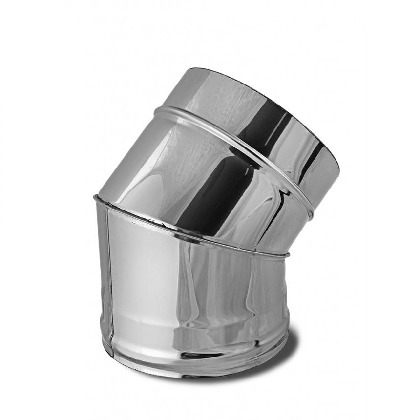 Отвод утепленный 45° 2-х сегментный ОТИ 45 производства «КДМ» выполнен из легированной титаном нержавеющей стали марки AISI 439TI, толщиной 1мм, которая обладает жаростойкими, антикоррозионными и кислотостойкими свойствами. Ее применение делает дымоход «КДМ» абсолютно надежным и долговечным, рекомендованным для применения в банных и отопичельных печах, каминных топках, а также твердотопливных котлах. Толщина изоляции 25 мм / 50 мм - огнеупорное одеяло "Супервул",+1260°