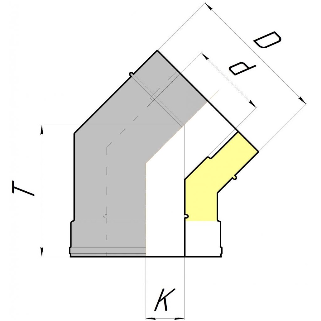 Отвод утепленный 45°, 2-х сегментный ОТИ 45 производства «КДМ» является основным фасонным элементом утепленной дымоходной системы, который позволяет изменить направление трубы на 45°, когда необходимо изменить угол или обойти препятствие. Отвод 45° 2-х сегментный ОТИ 45 представляет собой конструкцию (угловой элемент дымохода), состоящую из труб разного диаметра, между которыми находится огнеупорный керамический изолятор "Супервул", который обеспечивает утепление и защиту от образования конденсата, а так же является элементом первичной противопожарной разделки. Конструктивно состоит из 2 сегментов, что позволяет плавно изменить направление дымохода на 45°, не создавая сопротивления дымовому потоку. На концах отвода находятся внутренний и наружный раструбы, для соединения его с дымоходом. На место соединения Отвода с трубой наносится термостойкий силикатный герметик для обеспечения газоплотности.
