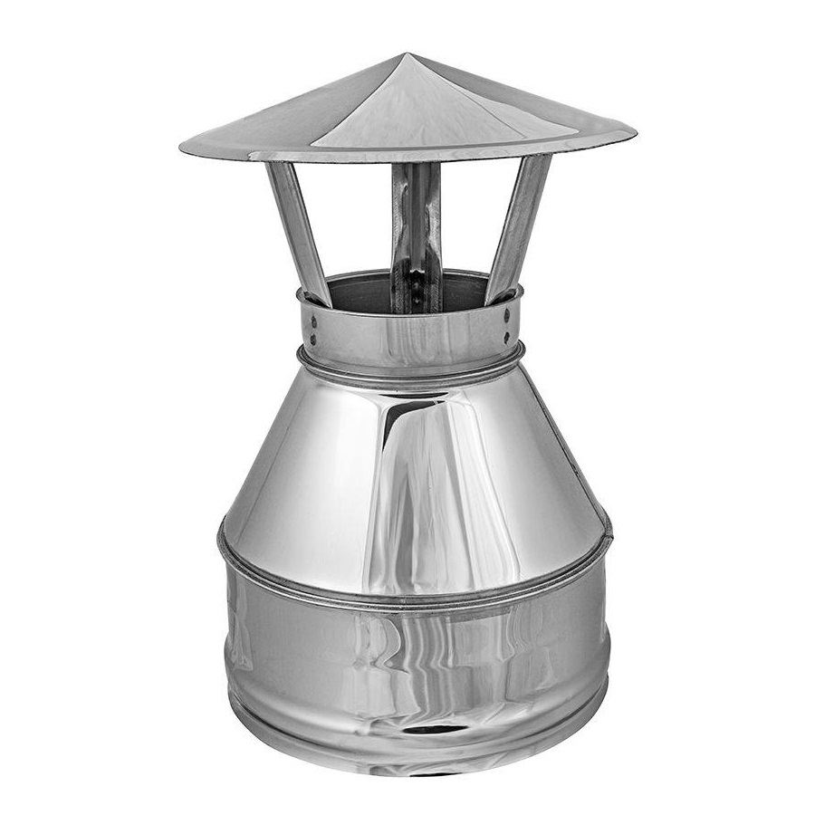 Коническое окончание с флюгарком КОФК производства «КДМ» выполнено из легированной титаном нержавеющей стали марки AISI 439TI, толщиной 1мм, которая обладает жаростойкими, антикоррозионными и кислотостойкими свойствами. Ее применение делает дымоход «КДМ» абсолютно надежным и долговечным, рекомендованным для применения в банных и отопичельных печах, каминных топках, а также твердотопливных котлах.