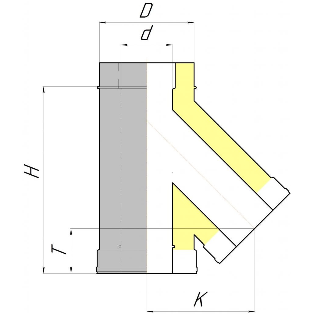 Тройник двустенный 45° ТТИ 45 производства «КДМ» является основным фасонным элементом двухконтурной дымоходной системы. Применяется для отвода дымовых газов в прямой участок дымохода, при подключении отопительного устройства к наружному дымоходу. Тройник двустенный 45° ТТИ 45 представляет собой конструкцию, состоящую из труб разного диаметра, между которыми находится огнеупорный керамический изолятор "Супервул", который обеспечивает утепление и защиту от образования конденсата, а так же является элементом первичной противопожарной разделки. Наличие тройника предотвращает попадание конденсата в отопительное устройство. В нижней части Тройника двустенного 45° ТТИ 45 находится фланец с внутренним раструбом, на который устанавливается ревизионная Заглушка ЗГ или Конденсатосборник КСБ, для ревизии дымохода и сбора конденсата. На место соединения тройника со стальными трубами наносится термостойкий силикатный герметик для обеспечения газоплотности. Тройник утепленный с углом в 45° позволяет не снижать скорость газового потока при подключении.