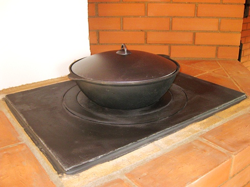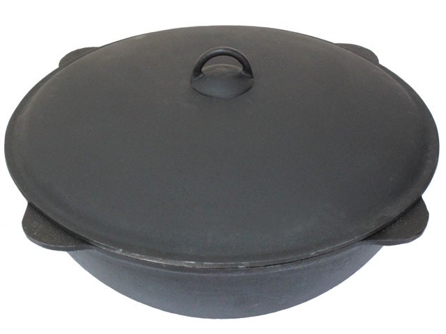 Чаша азиатская. Казан выполнен из серого чугуна, окрашен в черный цвет, низ закругленный, 4 ручки. Крышка казана выполнена из алюминия и окрашена в черный цвет.