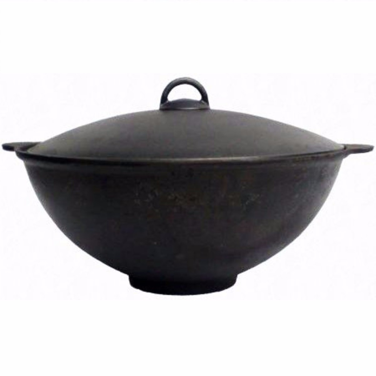 Чаша азиатская. Казан выполнен из серого чугуна, окрашен в черный цвет, 2 ручки, низ прямой. Крышка казана выполнена из алюминия и окрашена в черный цвет.