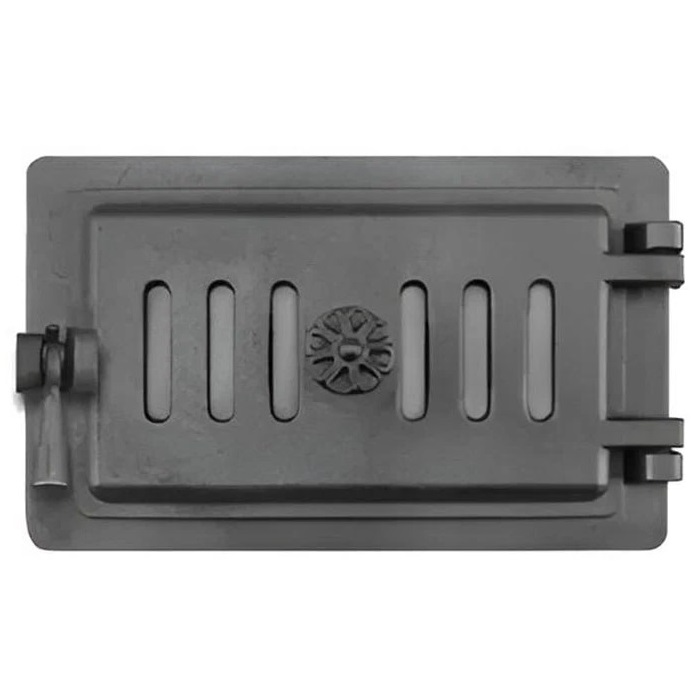 Герметичная с прижимной ручкой и отверстиями с регулировкой для подачи воздуха в зону горения. Выполнена из чугуна.