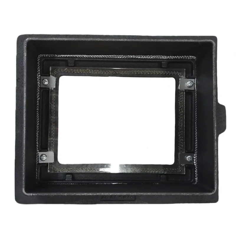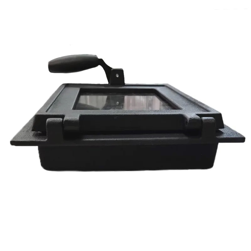 Крышка дверки оснащена термостойким стеклом, которое позволяет контролировать процесс горения, не открывая крышку. Крышка дверки и стекло оснащены термостойкими шнурами, которые предназначены для герметичного запирания крышки и уплотненного прилегания стекла, что исключает подсос воздуха