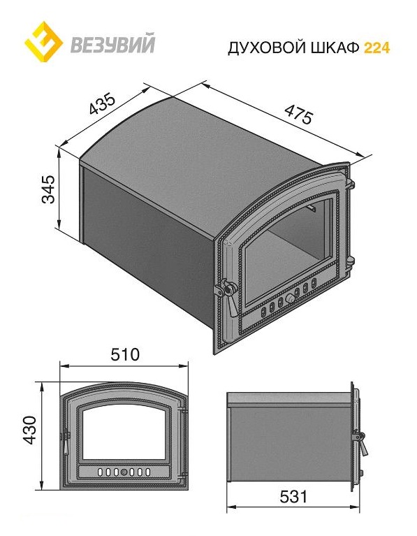 Духовка печная, дверка выполнены из чугуна со стеклом, Везувий 224 с арочной дверькой, крашеная. Стенки духовки выполнены из стали. Монтируется в домашние дровяные печи и служит для обогрева помещений и приготовления пищи. Дверка оснащена термостойким слектом немецкой фирмы Robax, толщина стекла 4 мм.
