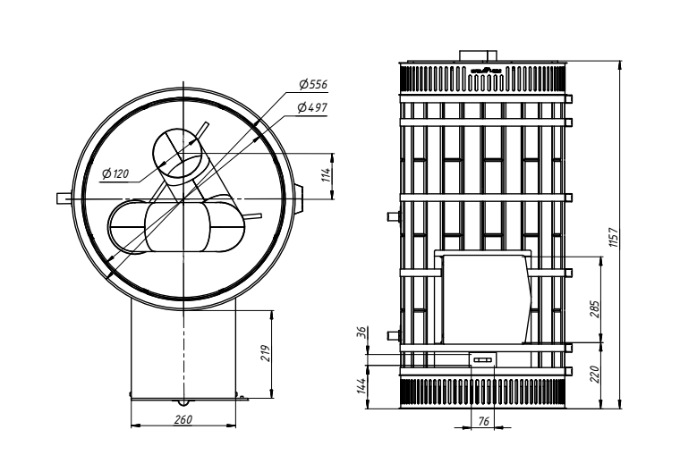 Круглая форма и система подачи вторичного воздуха обеспечивают равномерный прогрев по всей поверхности печи. Основание стоит на шанцах, благодаря чему, тепло не уходит в фундамент