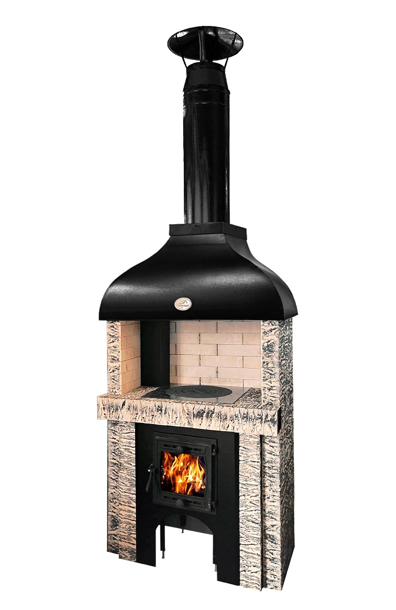 Собирается как конструктор, даже новичок соберёт за 3 часа. В инструкции дана пошаговая установка. Все детали пронумерованы и подогнаны – всего 18 кирпичных блоков, шамотная топка и фурнитура из металла. Возможна установка и на фундамент, и на брусчатку