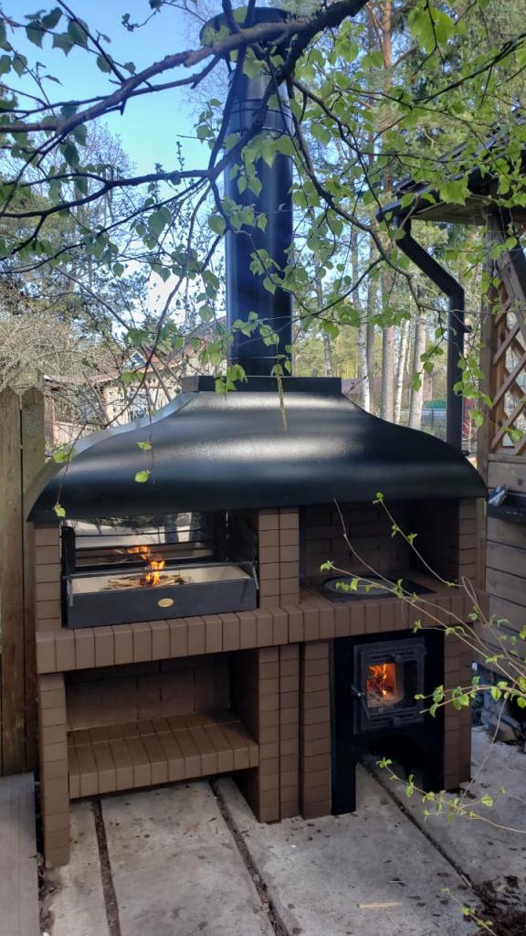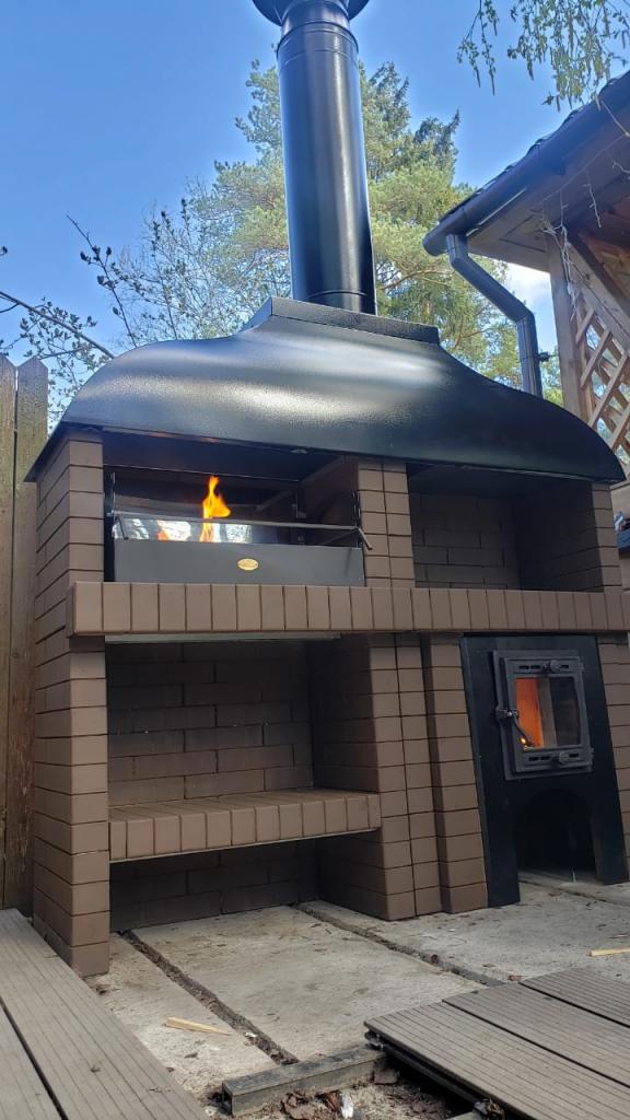 Конструкция мангала даёт равномерное горение углей. Жаростойкий кирпич накапливает тепло, регулируется высота рамки под шампура