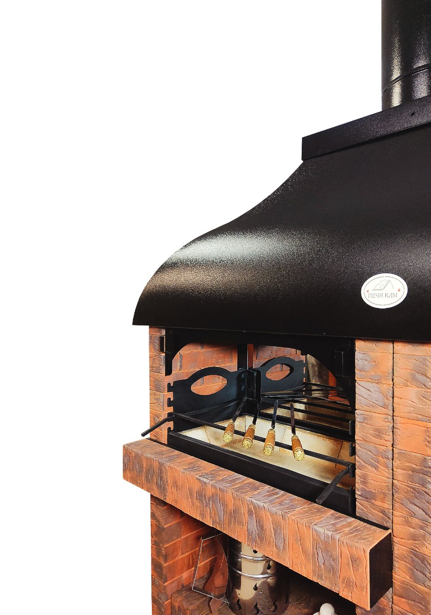 Конструкция мангала даёт равномерное горение углей. Жаростойкий кирпич накапливает тепло, регулируется высота рамки под шампура