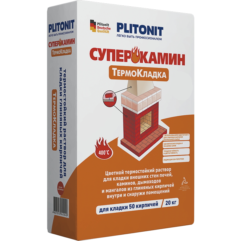 Предназначена для кладки внешних стен печей, каминов, дымоходов из глиняных кирпичей внутри и снаружи помещений. Обладает высокой технологичностью и водоудерживающей способностью, а также влагостойкостью, трещиностойкостью и низким расходом материала. Коэффициент температурного расширения раствора соответствует глиняному кирпичу.