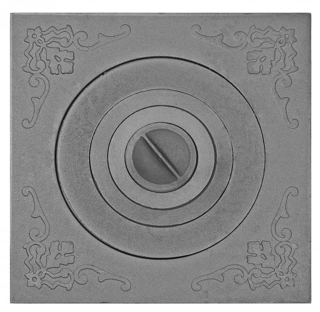 Плита чугунная с кольцами. С декорирующим рисунком. С обратной стороны имеет рёбра жесткости. Предназначена для установки в барбекю или в специальной печи для казана. Может быть использована для казанов вместимостью от 10 до 20 литров, в зависимости от геометрии казана и количества используемых колец. Выполнена плита из серого чугуна, оснащение её рёбрами жесткости и 4-я дополнительными кольцами делают эту плиту универсальной, надежной, долговечной и удобной в эксплуатации.