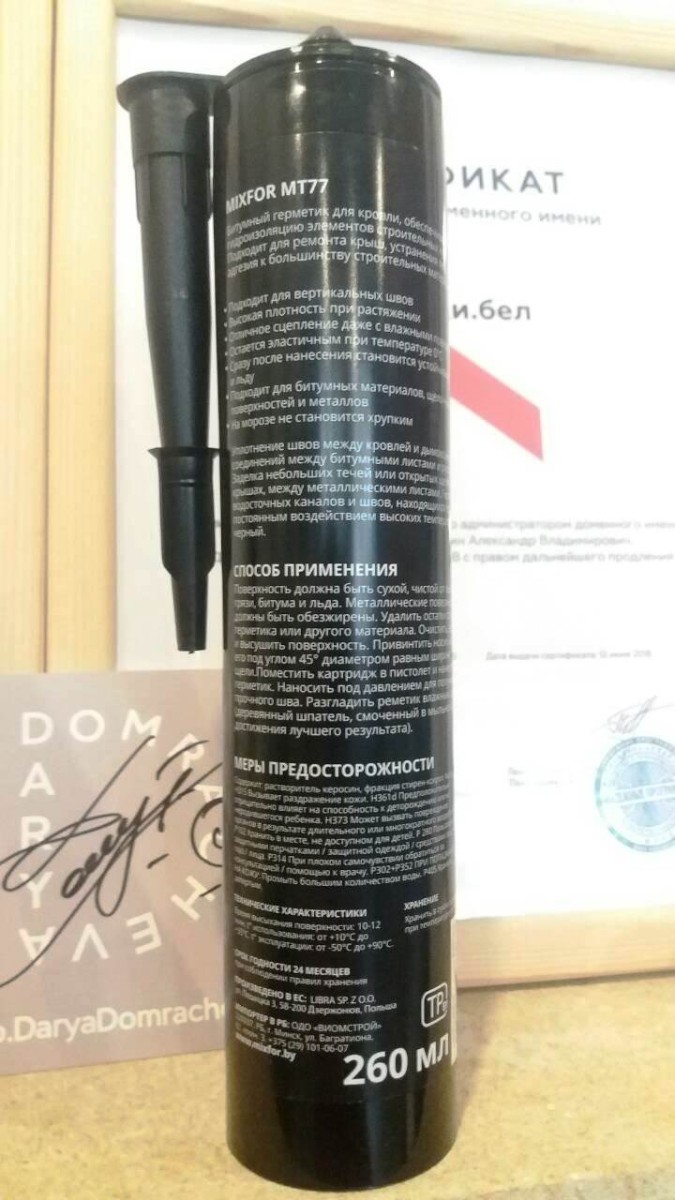 Применяется для холодной склейки всех видов рубероида, толя и битумной черепицы, герметизации соединений и заполнения швов при монтаже кровли и водосточных систем, устранения мелких течей на горизонтальных крышах. Подходит для применения в соединениях с небольшой подвижностью. Может наноситься на влажные поверхности. Обладает высокой адгезией практически ко всем металлам, древесине, бетону, черепице, кирпичу и другим минеральным поверхностям. Может быть использован для заполнения вертикальных щелей.