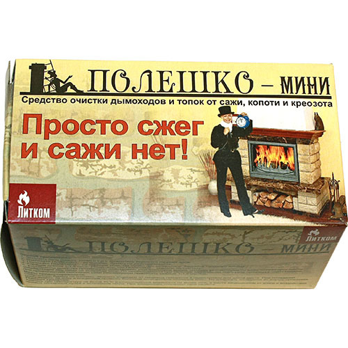 Полено "Полешко-мини" Изготовлено из углородо-органометаллический католизатор "Catalytic Soot remover". В составе имеются древесные опилки, активные добавки снижающие теипературу процесса и защищающие металлические части. При сгорании не выделяет формальдегидов, диоксидов и угарного газа. Полено предназначено для немеханической прочистки дымоходов от креозотных отложений, нагаров и сажи.