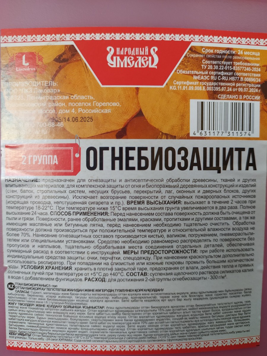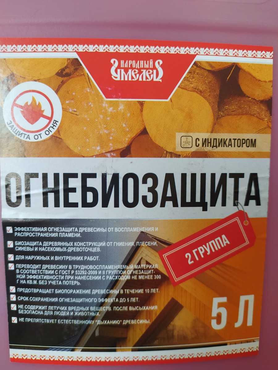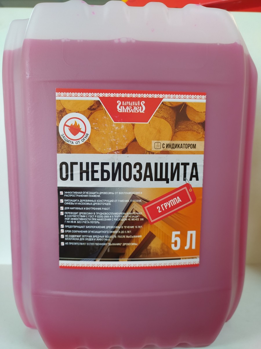 Состав пропиточный Огнебиозащита марки Народный умелец, предназначен для огнезащиты и антисептической обработки древесины, тканей и других впитывающих материалов. Для комплексной защиты от огня и биопоражения деревянных конструкций и изделий ( стен, балок, стропильных систем, несущих брусьев, перекрытий, лаг, оконных и дверных блоков, других конструкций из дерева ). Исключает возгорание поверхности от случайных пожароопасных источников  ( искрящая проводка, непотушенная сигарета и пр. ).