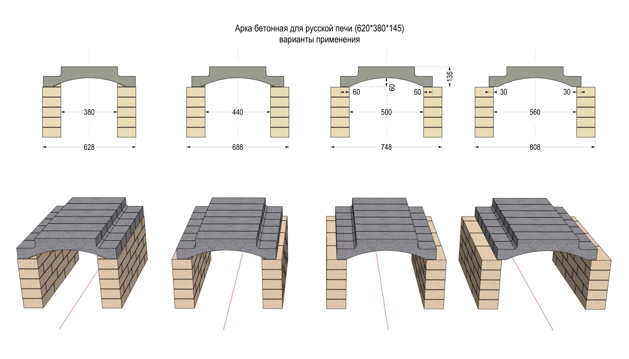 Арку из жаростойкого бетона для русской печи можно использовать для перекрытия различных видов пролётов – увеличивая или уменьшая опорные части. Данным элементом можно перекрыть пролёт от 380 до 560 мм. Минимальная опора – 30 мм.