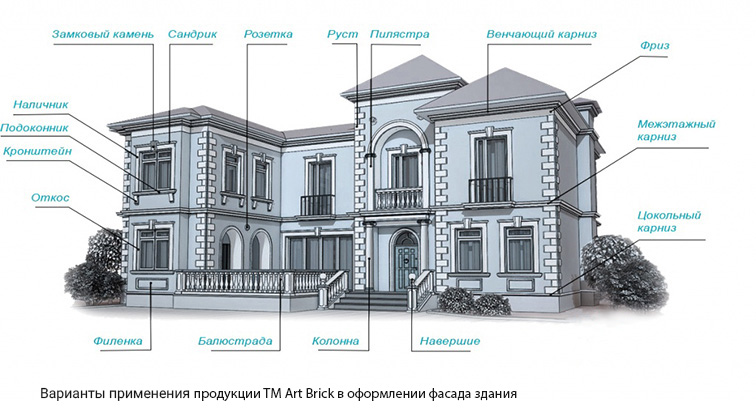 В архитектуре зданий продукция ТМ ART BRICK применяется очень широко. Стильно смотрятся обрамления, карнизы, подоконники, кронштейны, фризы. В отличие от традиционной лепнины, выполненной из гипса, пенопласта или артбетона, элементы, выполненные из натурального керамического кирпича машинной обработки, смотрятся богато, надежно, стильно. Такой материал не выбивается из общей концепции, являясь однородным с кирпичом массива здания. Богатство выбора декоративных элементов позволяет реализовать разные стили: от строгого европейского минимализма и классицизма, до барокко.